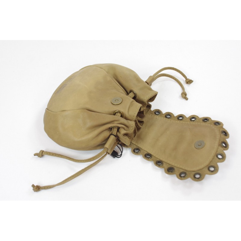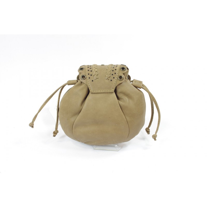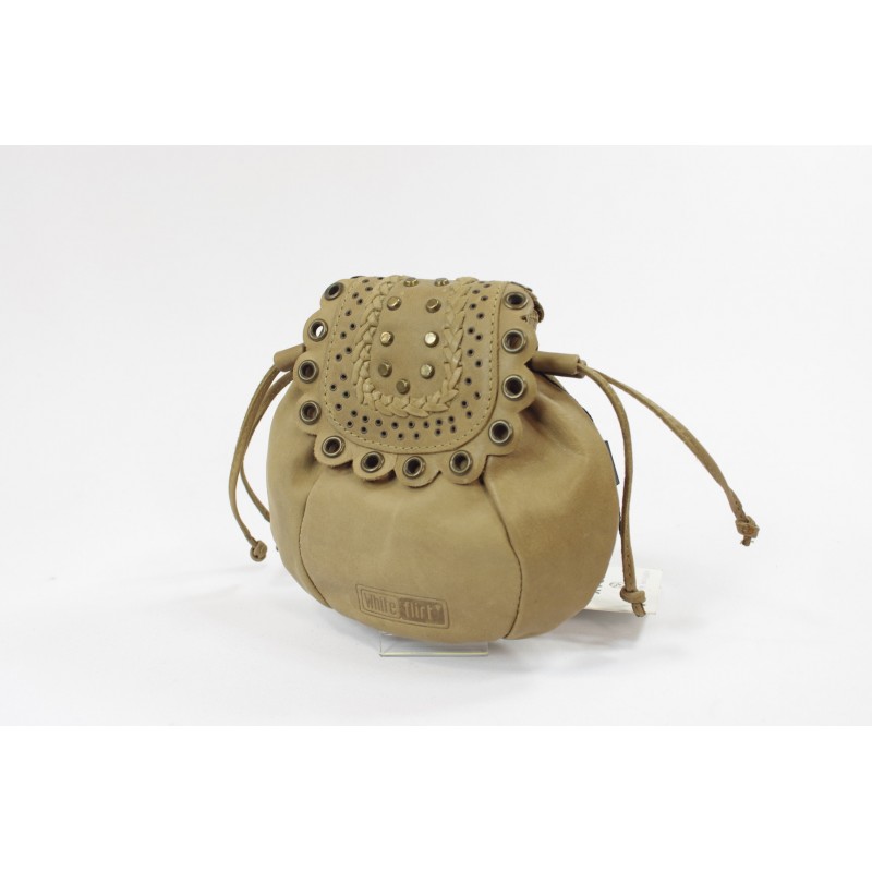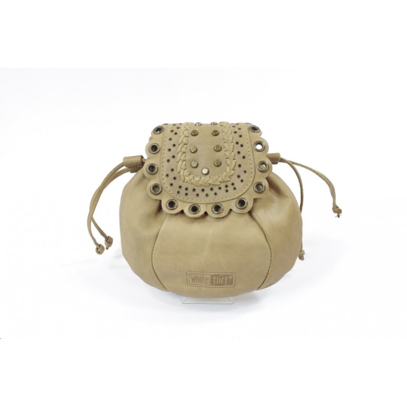 Oryginalna damska saszetka duńskiej firmy ADAX z kolekcji WhiteFlirt. Wykonana z najwyższej jakości miękko wyprawionej naturalnej skóry. Zapinany na magnes, woreczek ściągany skórzanymi rzemieniami zakończonymi efektownymi "kłami" wykonanymi z metalu. Na klapce metalowe pukle w kolorze miedzianym.