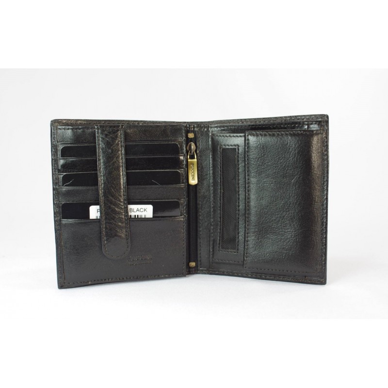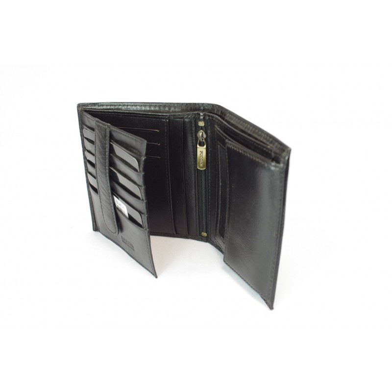 Męski portfel firmy PUCCINI. Wykonany z wysokiej jakości naturalnej skóry, wewnątrz 11 miejsc na karty płatnicze, 4 schowki ( w tym 1 zapinany na zamek), jedno zasiatkowane okienko. Dwie przegrody na banknoty. Portfel posiada kieszonkę na bilon, zapinaną na nap. Pod klapką znajdują się dwa miejsca na karty.
