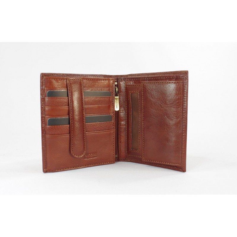 Męski portfel firmy PUCCINI. Wykonany z wysokiej jakości naturalnej skóry, wewnątrz 11 miejsc na karty płatnicze, 4 schowki ( w tym 1 zapinany na zamek), jedno zasiatkowane okienko. Dwie przegrody na banknoty. Portfel posiada kieszonkę na bilon, zapinaną na nap. Pod klapką znajdują się dwa miejsca na karty.