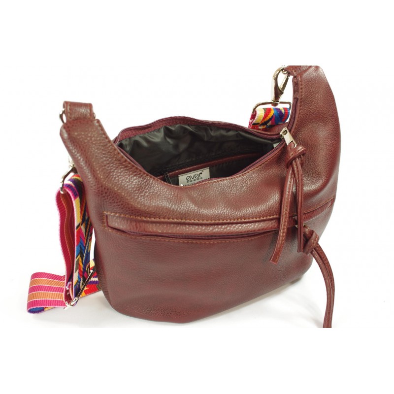 Mała torebka typu raportówka Ever. Torebka posiada dwa paski. Jeden skórzany, drugi kolorowy, parciany o szerokości 5 cm. Wewnątrz torebka posiada jedną komorę, kieszonkę zapinaną na zamek i miejsce na telefon. Szeroka zewnętrzna kieszonka ( 28 cm) umieszczona z przodu torby.