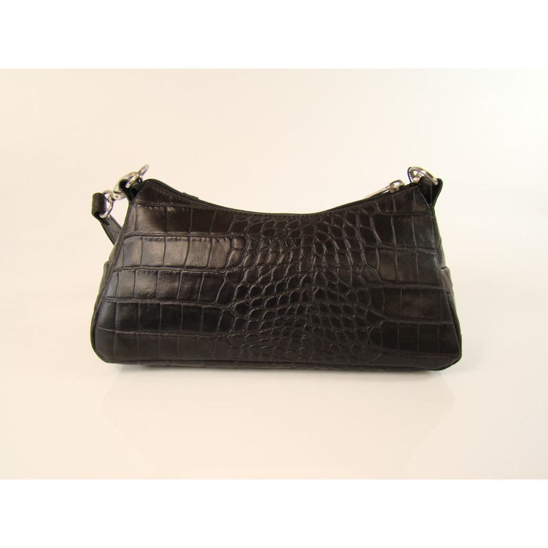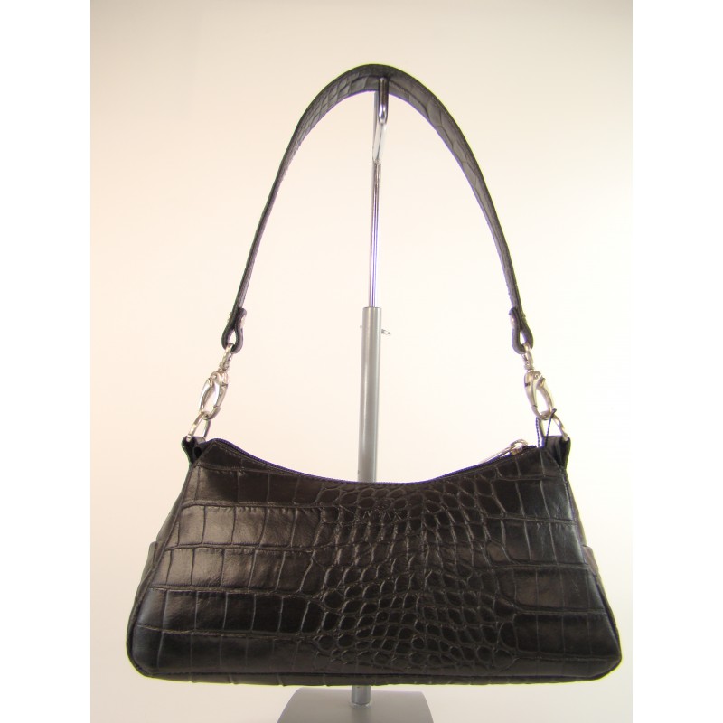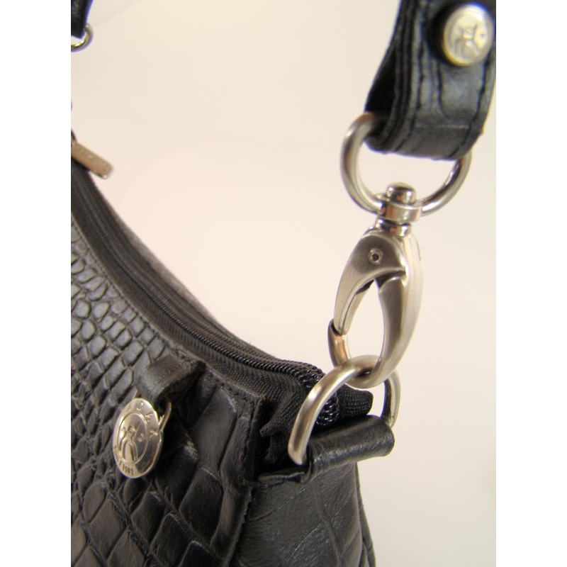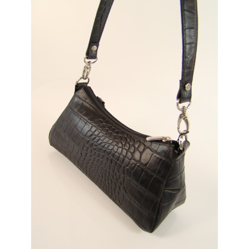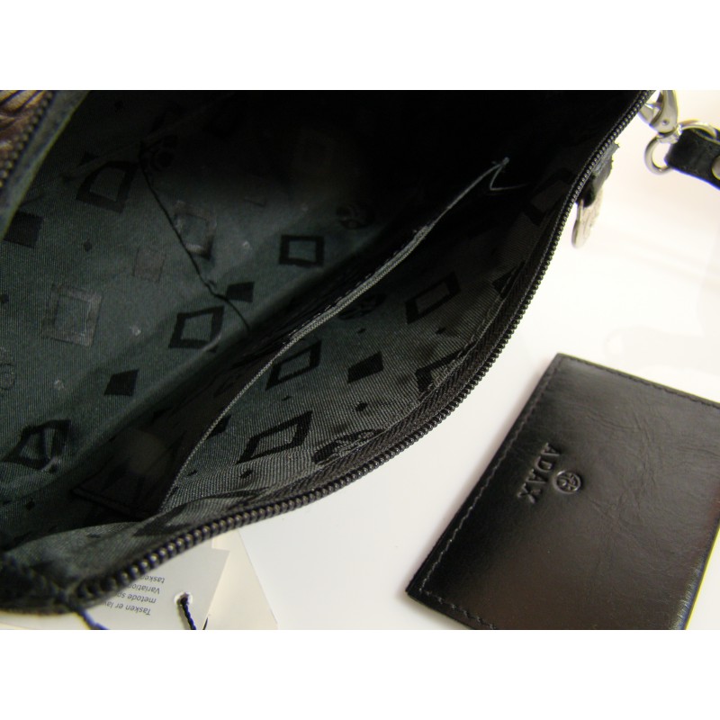 Mała torebka damska duńskiej firmy ADAX wykonana z najwyższej jakości naturalnej skóry z tłoczeniem typu "snake". Zapinana na zamek błyskawiczny, wewnątrz kieszonka na telefon komórkowy, skórzane etui na karty płatnicze. Krótka, odpinana rączka, sygnowane dodatki.